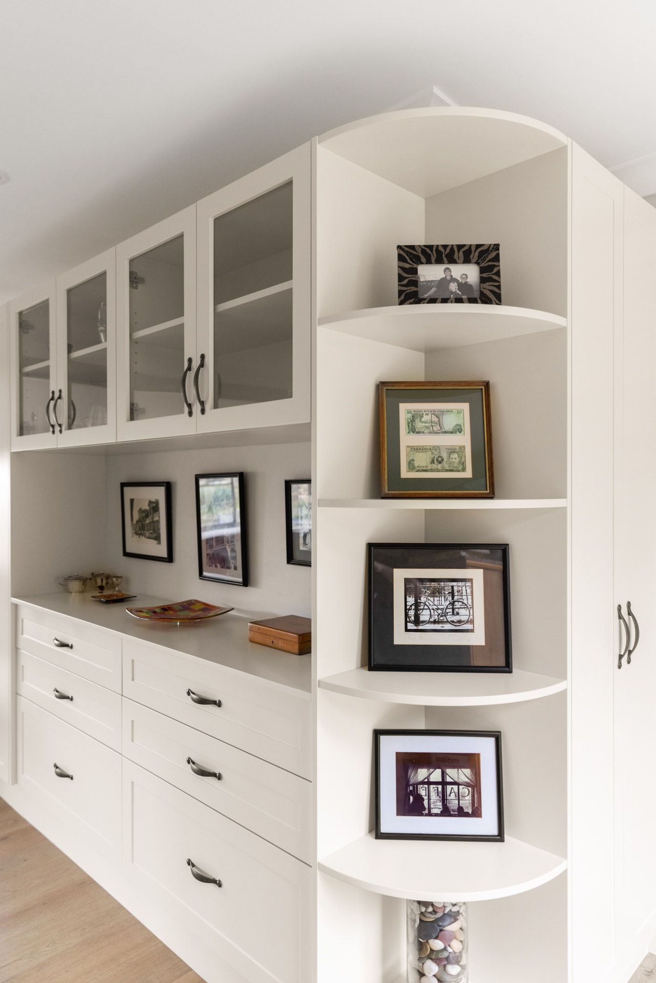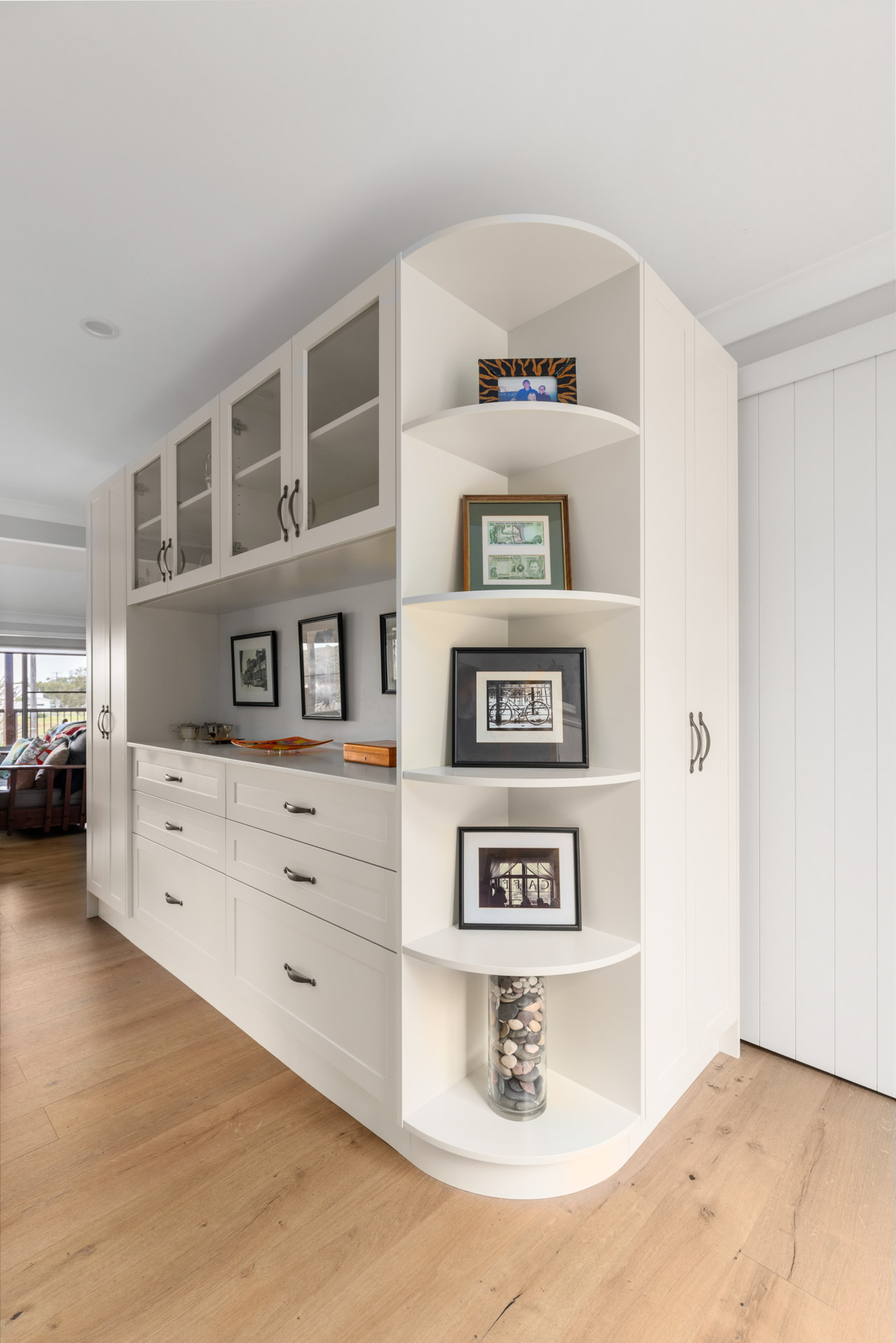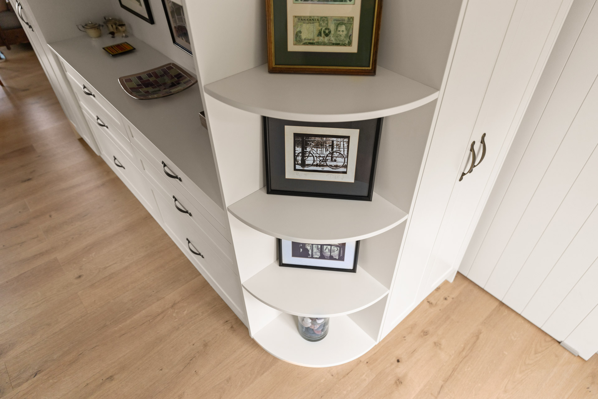 Featuring a premium 2-pac finish in a soft, neutral hue, this bespoke joinery provides a timeless canvas for showcasing and storing meaningful pieces. Thoughtfully designed curved shelves soften the hallway corner, delivering both visual flow and functional elegance.