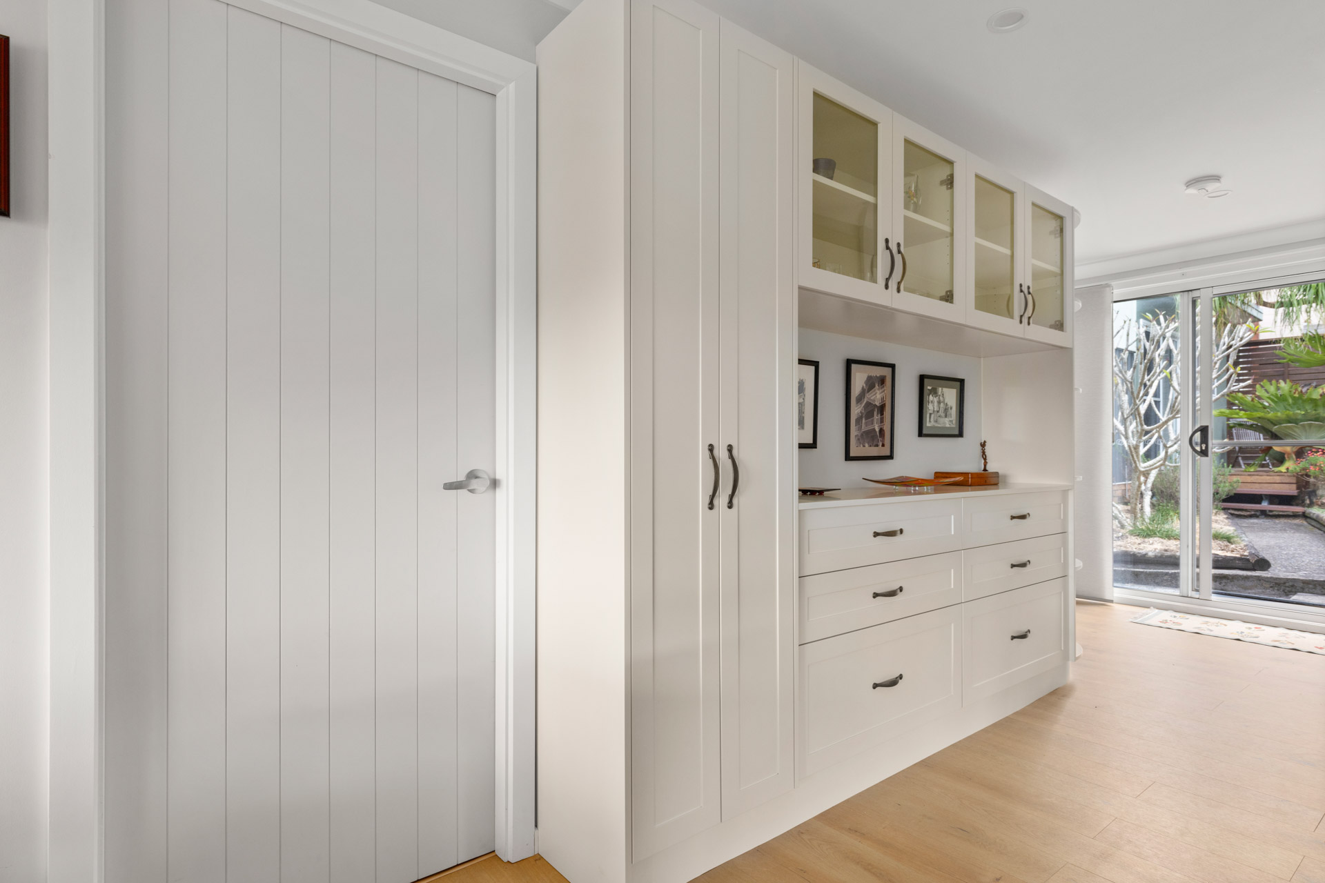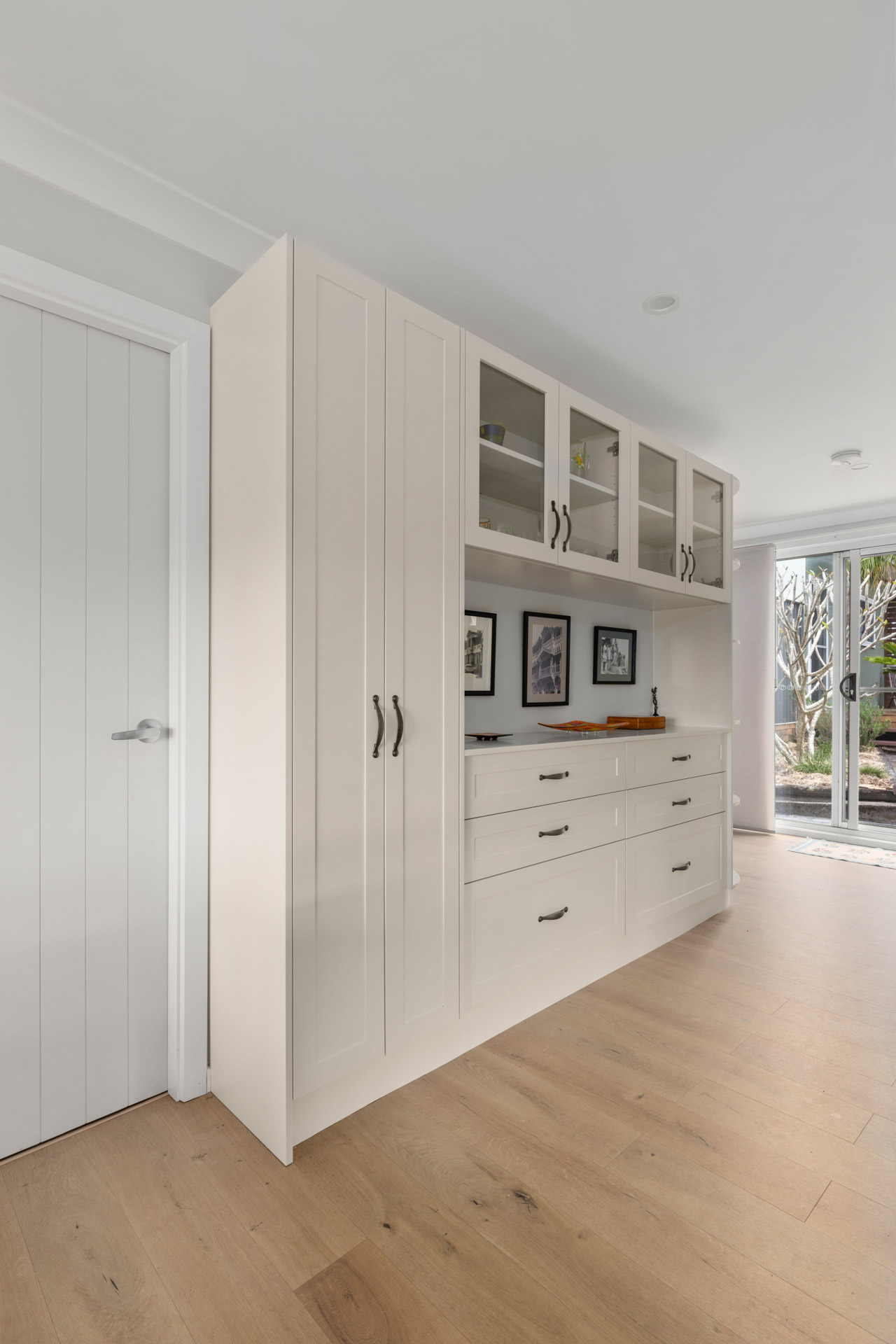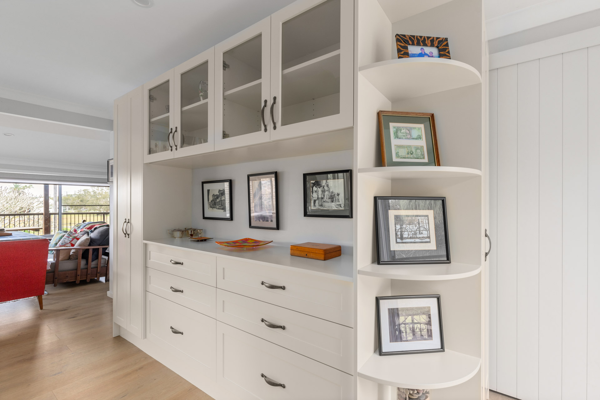 Featuring a premium 2-pac finish in a soft, neutral hue, this bespoke joinery provides a timeless canvas for showcasing and storing meaningful pieces. Thoughtfully designed curved shelves soften the hallway corner, delivering both visual flow and functional elegance.