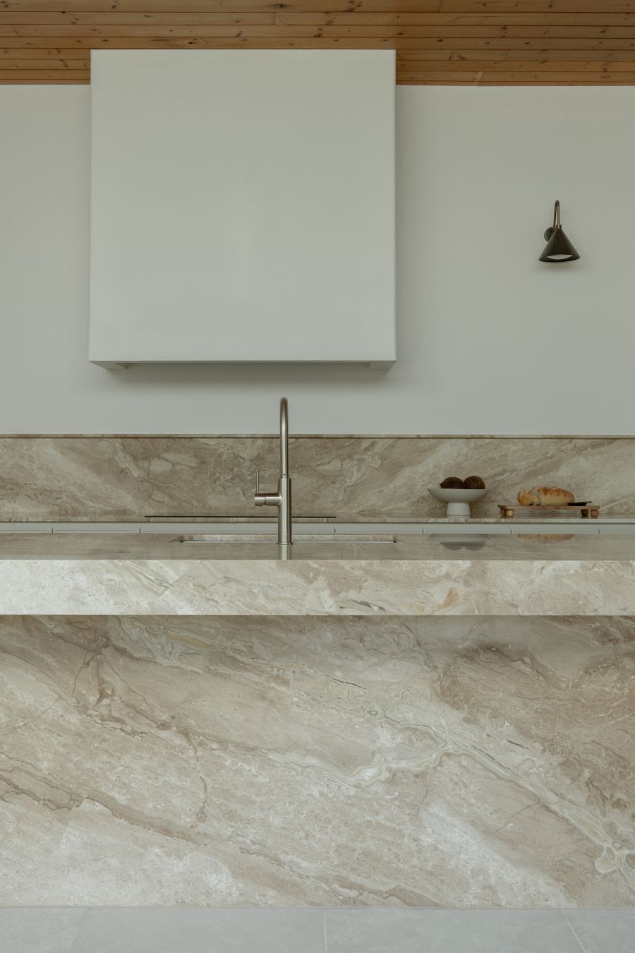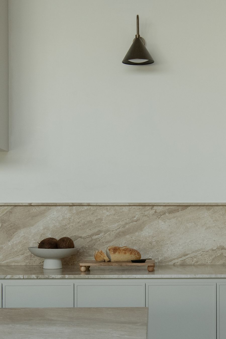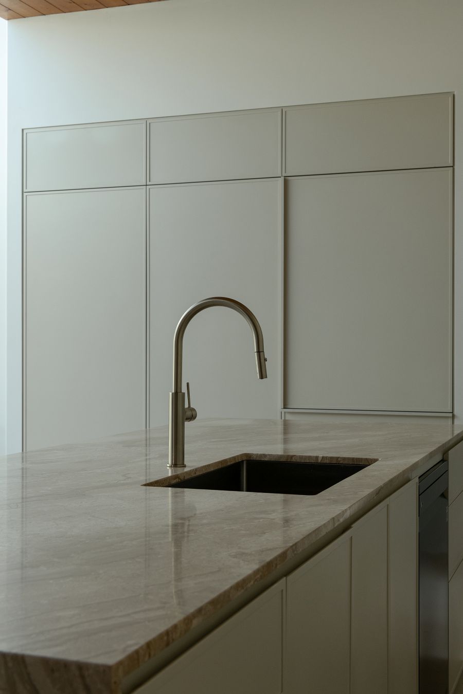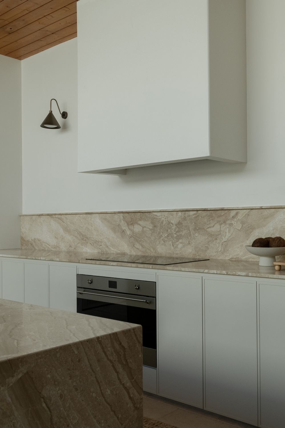 The cabinetry has a premium 2pac finish, creating a smooth, durable surface that reflects light beautifully and stands up to daily use. Combined with natural stone and warm timber overhead, the space feels inviting, relaxed, and effortlessly refined.