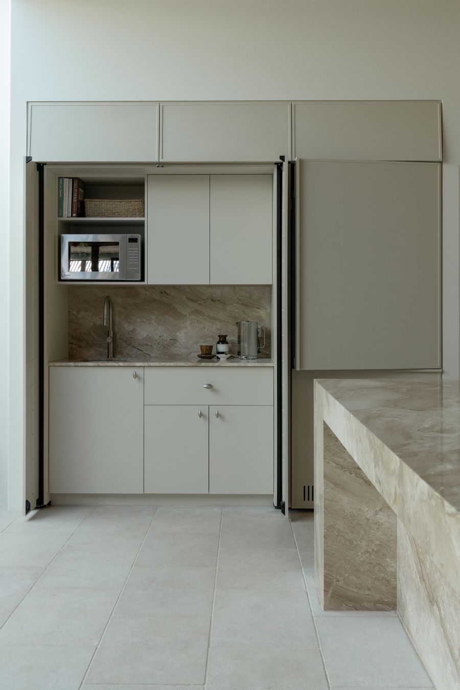 A cleverly designed appliance cupboard with pocket doors further enhances the functionality of the space, housing an integrated fridge, additional sink, microwave, generous bench space, and ample storage. Thoughtfully considered, this inclusion supports the efficiency and everyday demands of a young family, keeping the main kitchen area streamlined while ensuring everything is within easy reach.