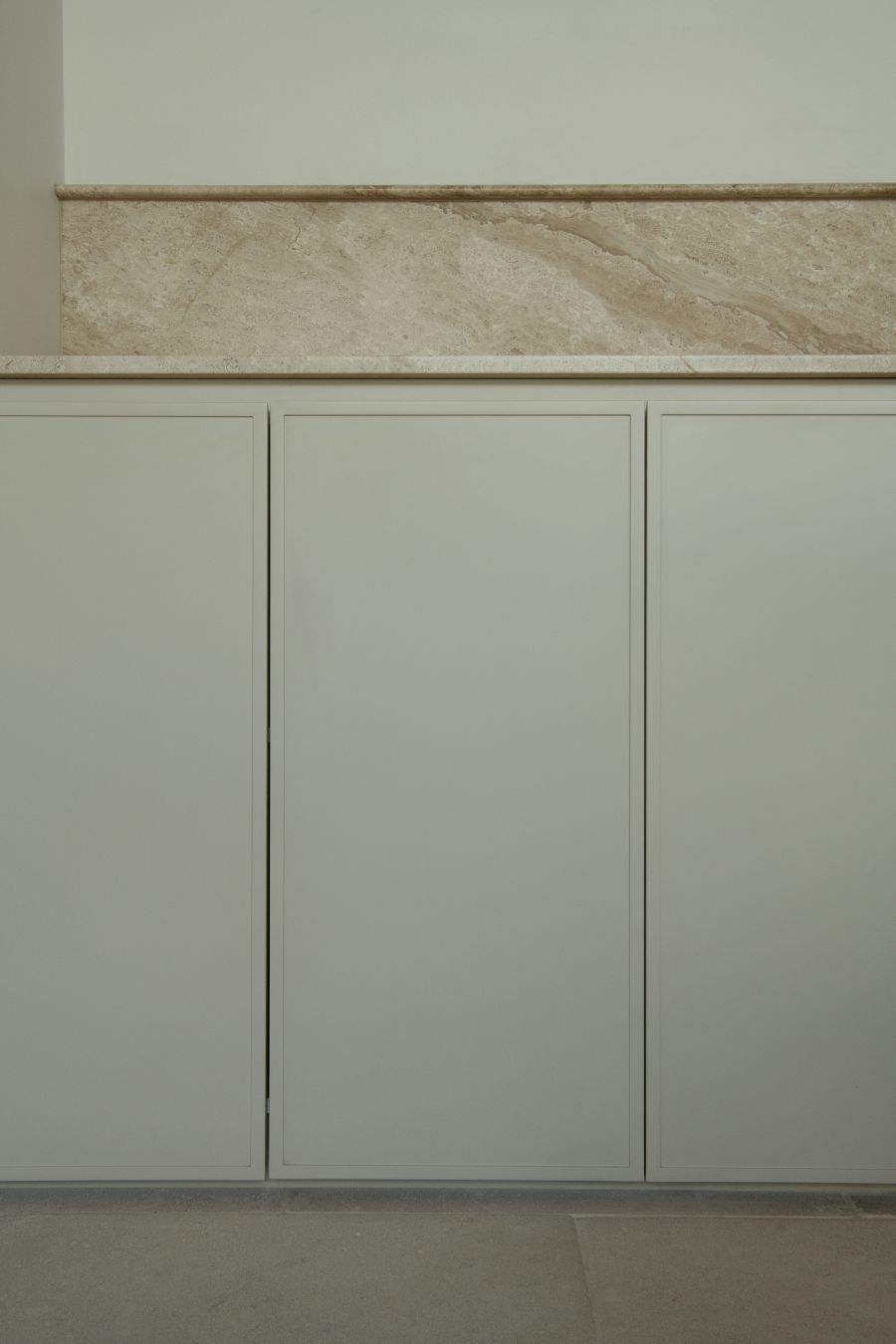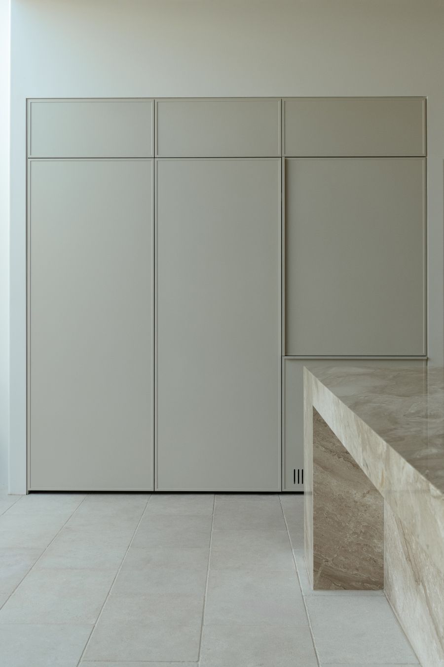 This kitchen showcases a beautifully balanced design, combining the timeless appeal of slim shaker profile cabinetry with a soft, contemporary palette. The narrow framing of the shaker doors introduces subtle detail without overwhelming the space, creating a refined and understated aesthetic.