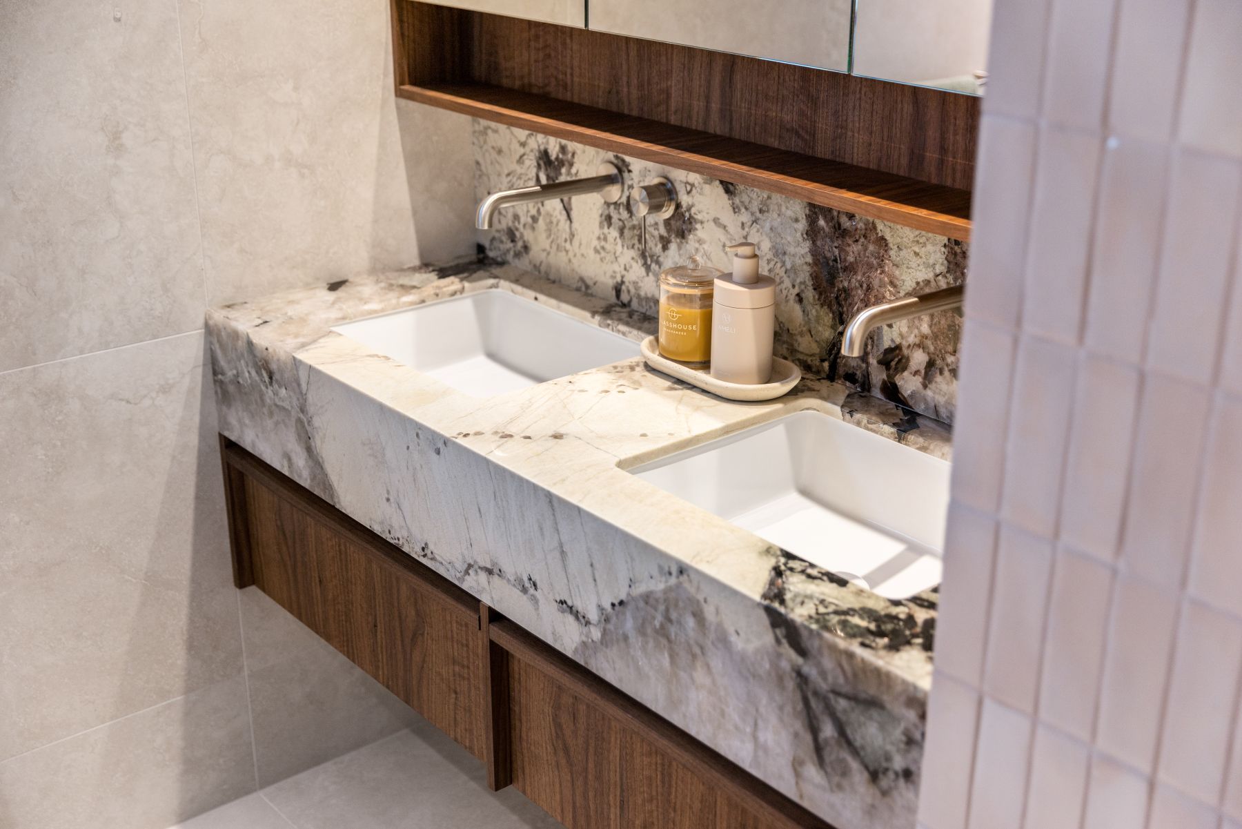 The luxurious Patagonia marble vanity creates a harmonious and uplifting aesthetic which is complimented by a clever layout with double sinks, mirrored shaver cabinet doors and LED lighting.