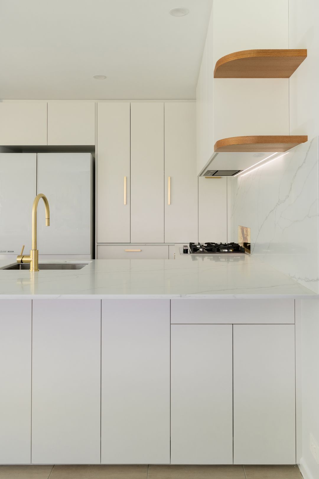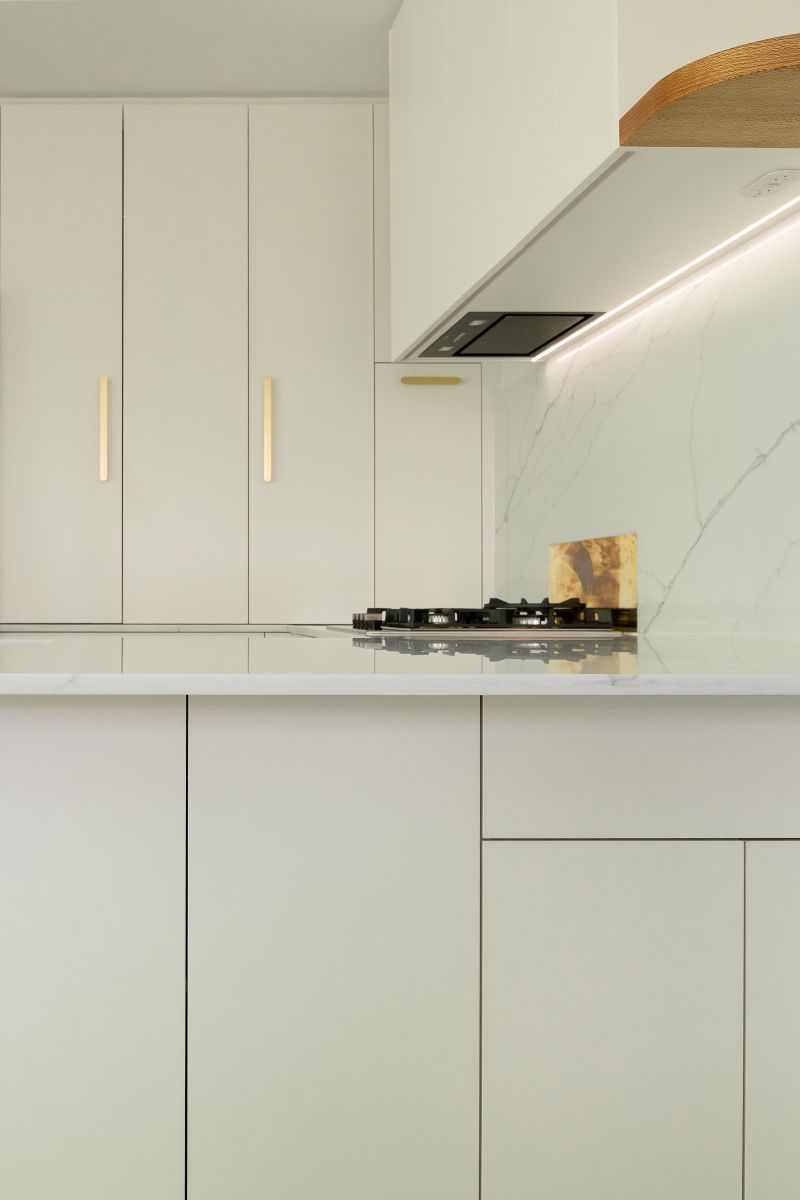 This kitchen renovation is a refined balance of calm minimalism, natural warmth with brass accents that add a sense of luxury.