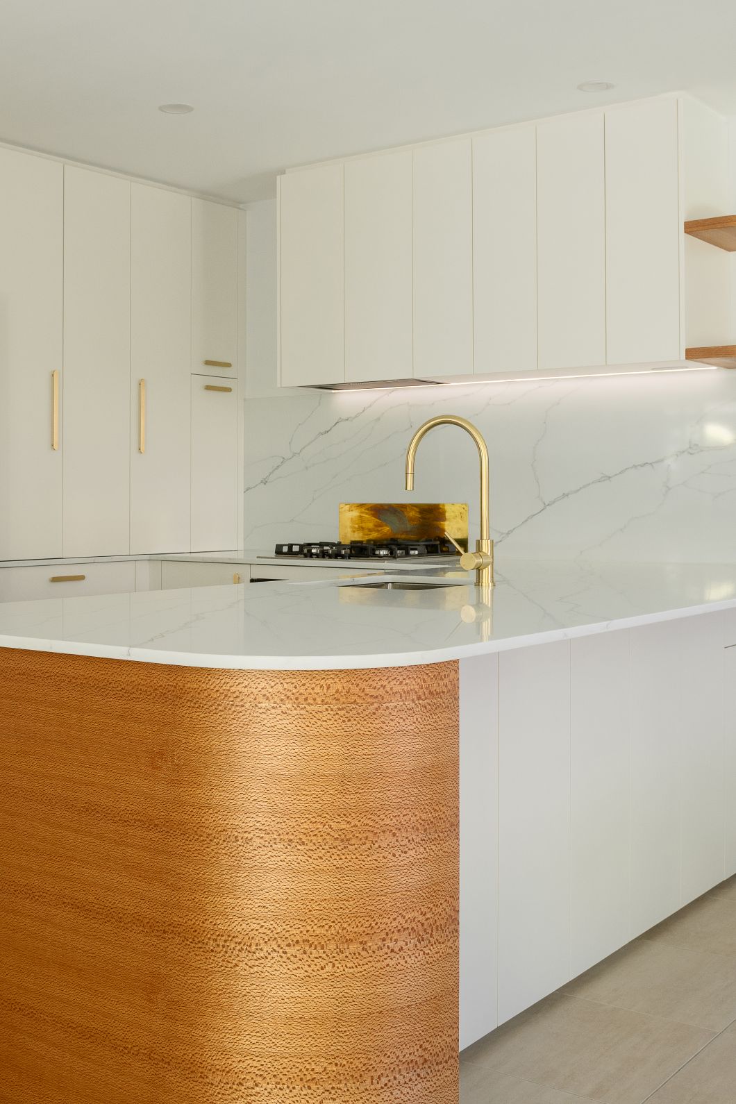 Laminex Ghostgum doors set a soft, contemporary backdrop, offering a subtle neutral tone that allows the materials to shine without overwhelming the space. The hero is the Silky Oak veneer curved benchtop end, finished with Rubio Oil to enhance the timber’s natural grain and tactile richness. Beautifully paired with brass accents that add a richness and will continue to patina and develop character over time.