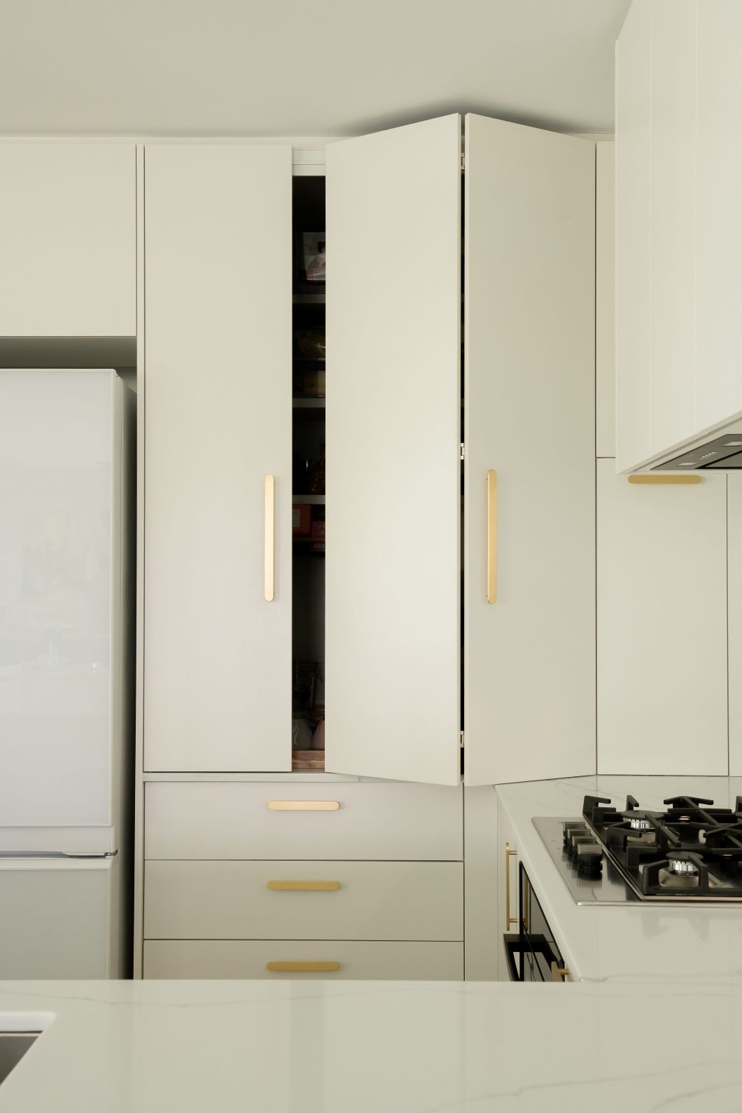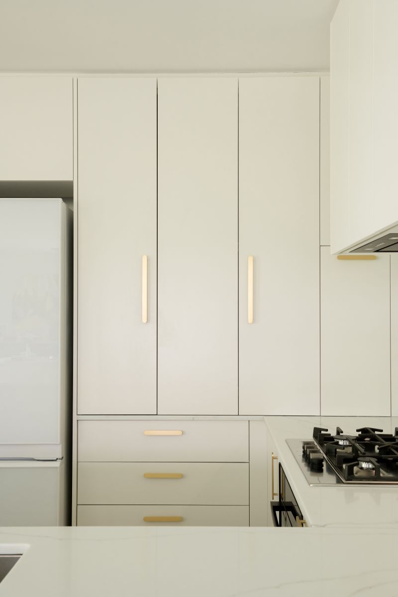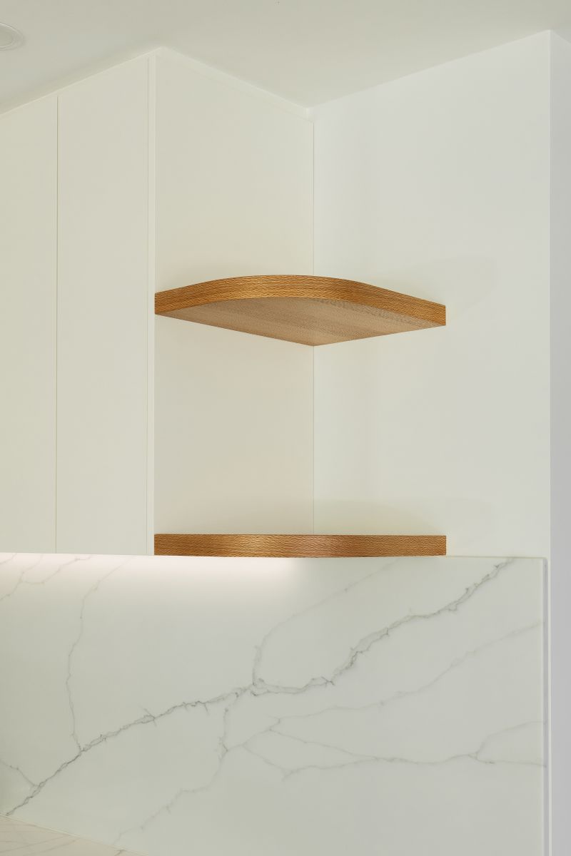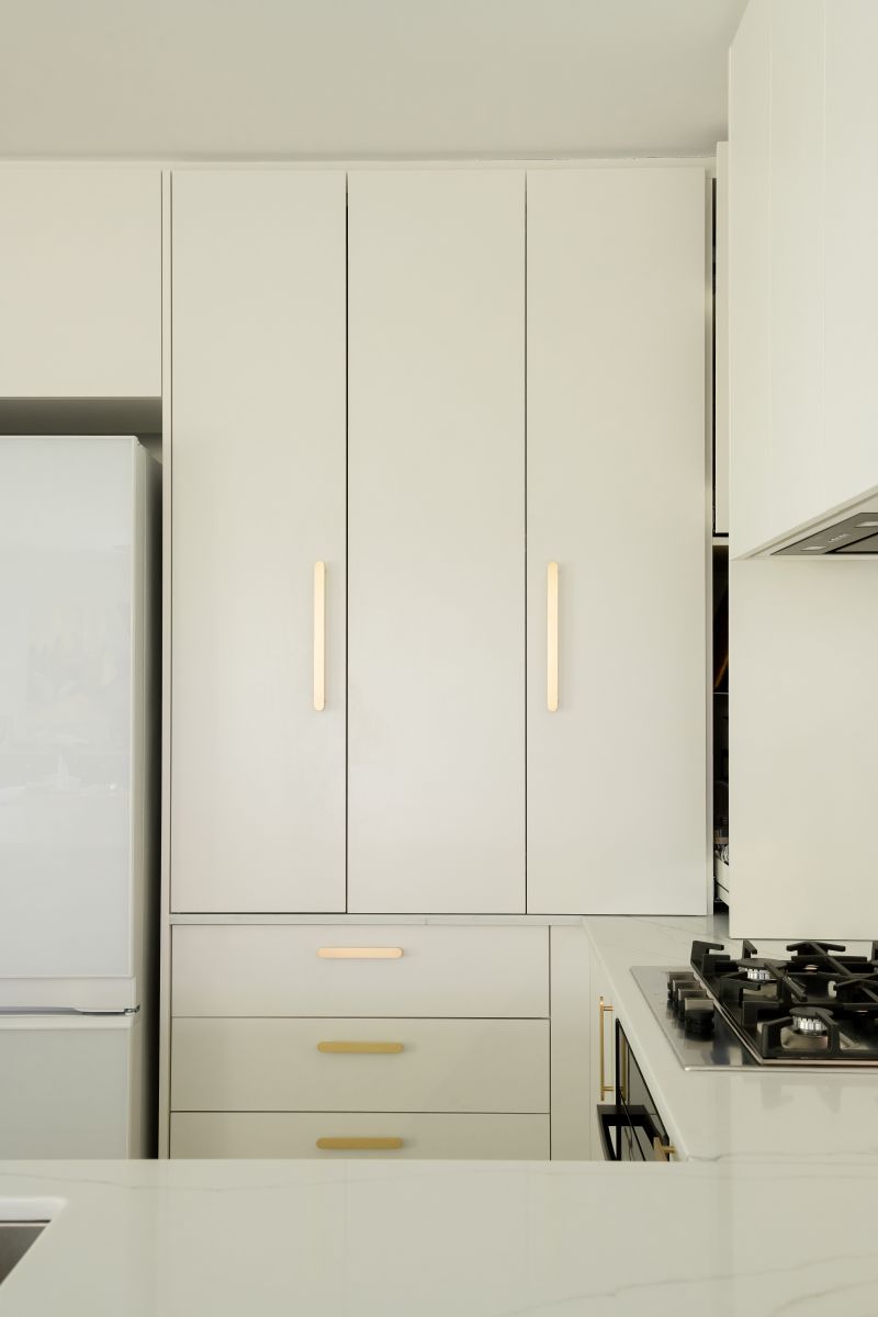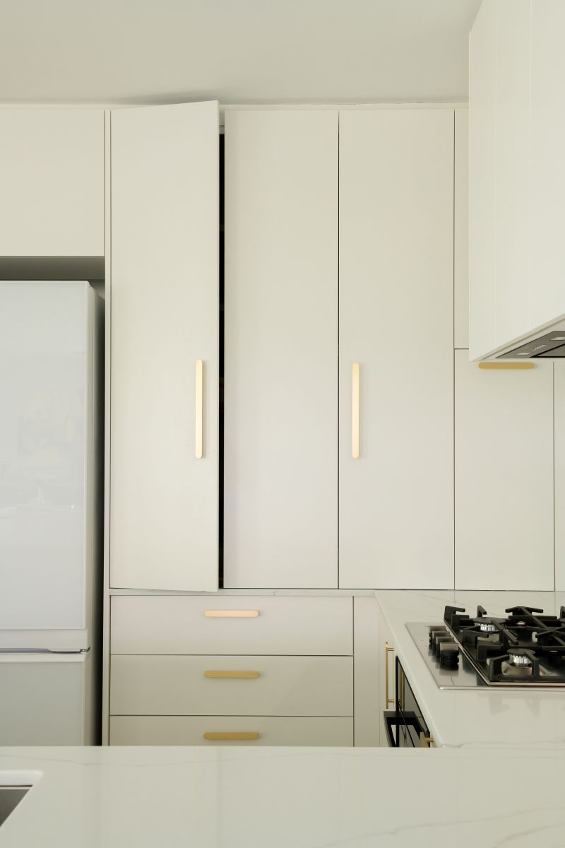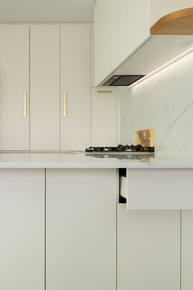 These thoughtful inclusions allow the kitchen to function seamlessly behind the scenes, keeping everyday essentials neatly concealed while preserving the calm, sculptural quality of the space.